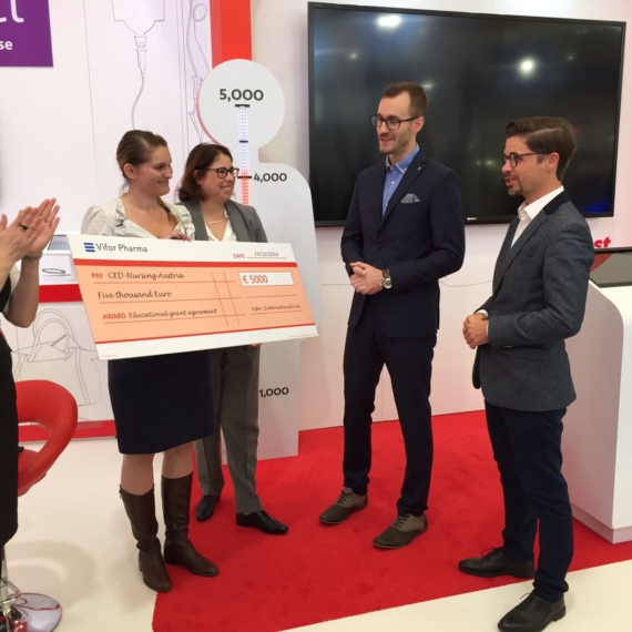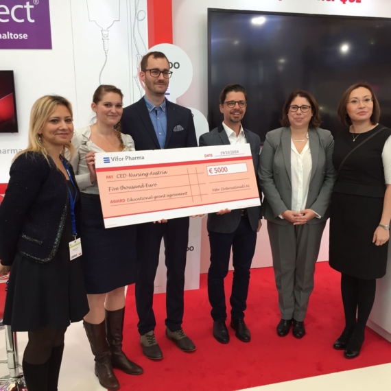 Über einen internationalen unrestricted Grant in der Höhe 5.000 Euro darf sich CED-Nursing Austria freuen. Die Spende wurde der Vereinsdelegation durch Vifor Pharma AG im Rahmen der UEG Week 2016 (UEG – United European Gastroenterology) überreicht und wird zur Weiterentwicklung der CED-Nursing Ausbildung dienen, die ab 2017 nun erstmals auch in Österreich als §64 GuKG Weiterbildung angeboten wird. CED-Nursing Austria trägt mit der Ausbildung aktiv zur Verbesserung der CED-Versorgung in Österreich bei und stärkt dabei auch die qualitätsorientierte Zusammenarbeit zwischen Pflege und Ärzteschaft.