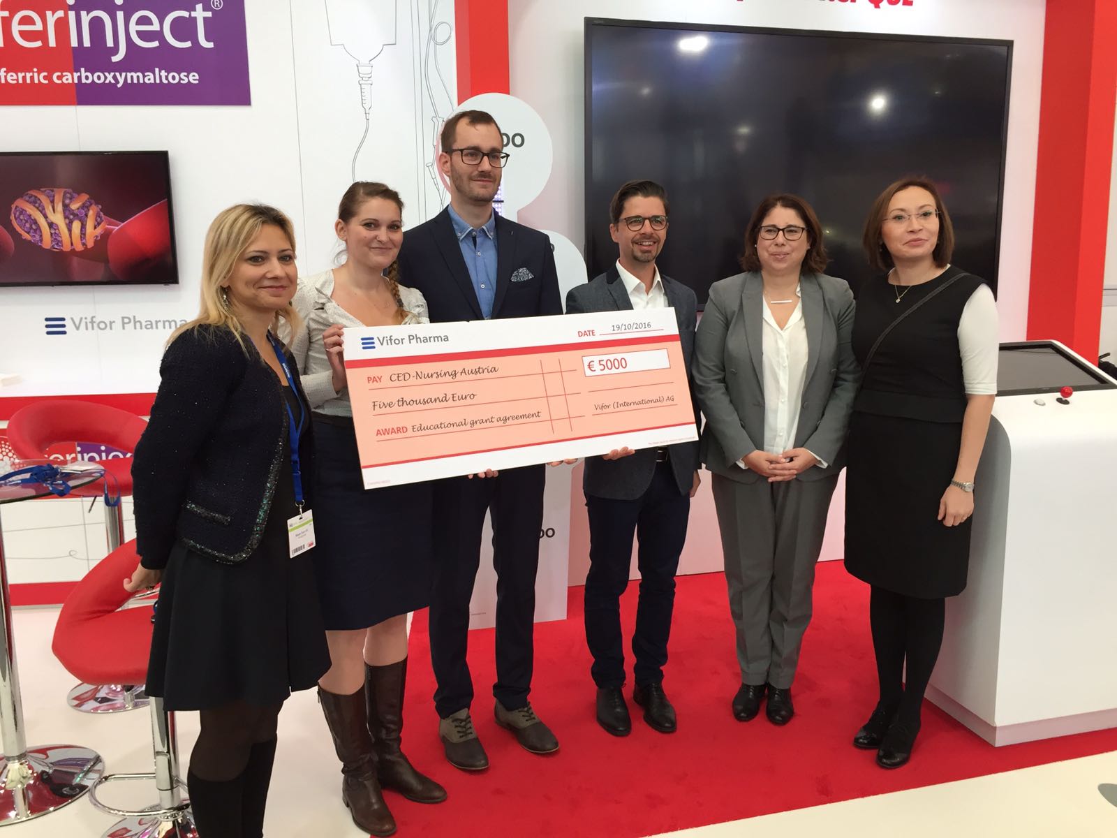 Über einen internationalen unrestricted Grant in der Höhe 5.000 Euro darf sich CED-Nursing Austria freuen. Die Spende wurde der Vereinsdelegation durch Vifor Pharma AG im Rahmen der UEG Week 2016 (UEG – United European Gastroenterology) überreicht und wird zur Weiterentwicklung der CED-Nursing Ausbildung dienen, die ab 2017 nun erstmals auch in Österreich als §64 GuKG Weiterbildung angeboten wird. CED-Nursing Austria trägt mit der Ausbildung aktiv zur Verbesserung der CED-Versorgung in Österreich bei und stärkt dabei auch die qualitätsorientierte Zusammenarbeit zwischen Pflege und Ärzteschaft.